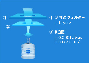 ウォーターネットの水は、アメリカで開発された「RO膜」と呼ばれる0.0001ミクロンの微細フィルターでろ過を行っています。RO膜は水のみを通し、電解イオンや塩類など水以外の不純物は通しません。一般の浄水器では0.01ミクロンまでが限界ですが、それよりもさらに小さい孔で超微小物質をシャットアウト。水と不純物を分解するために浸透圧以上の圧力をかけることで、さらにピュアな水を生み出しています。
