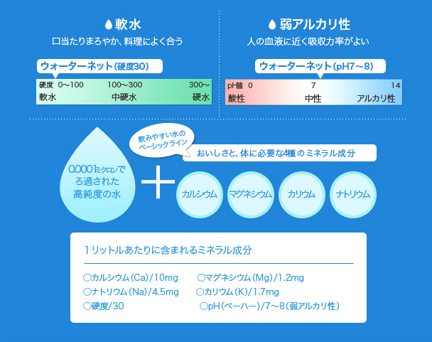 不純物を徹底してとりのぞき、当社ミネラル専用工場で精製された4種類の良質なミネラルをバランスよく配合。まろやかな風味が広がる、日本人好みの軟水に仕上げています。また、pH値は人の血液に近い弱アルカリ性。吸収率がよく、毎日の飲料に調理にと幅広く活躍します。